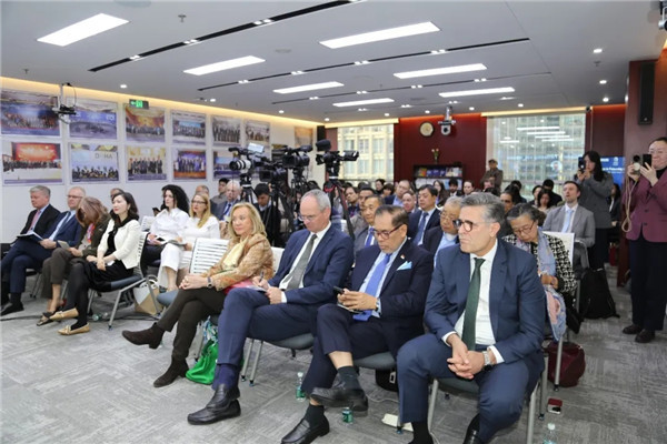 爱沙尼亚驻华大使韩朔(Hannes Hanso)、斐济驻华大使李振凡(Robert Lee)、印度尼西亚驻华大使周浩黎(Djauhari Oratmangun)、奥地利驻华大使海沃福(Wolf Dietrich Heim)、西班牙驻华大使玛尔塔·贝坦索斯·罗伊格(Marta Betanzos Roig)、巴基斯坦驻华大使卡里尔·拉赫曼·哈什米(Khalil Ur Rahman Hashmi)、芬兰驻华大使明凯(Mikko Kinnunen)、天邻智库(Global Neighbours)创始人兼主席乔万卡·保时捷(Jovanka Porsche)、经合组织(OECD)驻华代表海博(Tamas Hajba)、日本贸易振兴机构(JETRO)北京代表处所长、东北亚地区总代表小野寺修 Osamu Onodera)、商务部世界贸易组织司原司长、世界贸易组织服务贸易司原司长柴小林、中国驻美国大使馆原商务公使朱洪、中国人民大学国际事务研究所所长、欧盟研究中心主任王义桅。此外,克罗地亚、土耳其、哥伦比亚、马耳他、日本等国驻华使馆代办、参赞及秘书,以及意大利、西班牙、奥地利、巴基斯坦等国使馆其他外交官代表也出席了活动。